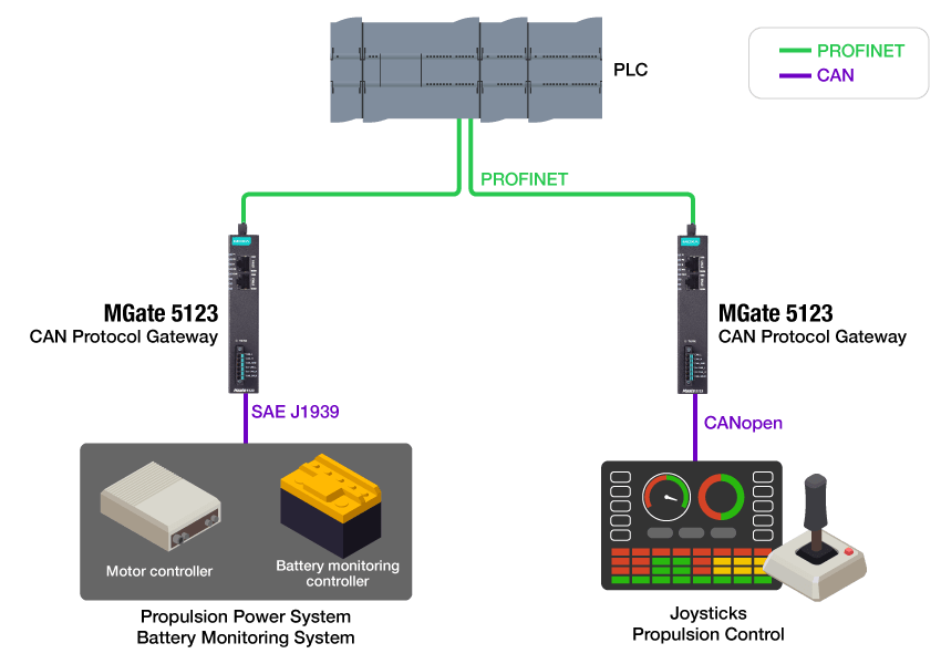 - The MGate 5123 enables seamless communication between J1939 or CANopen devices and PROFINET-enabled PLCs.